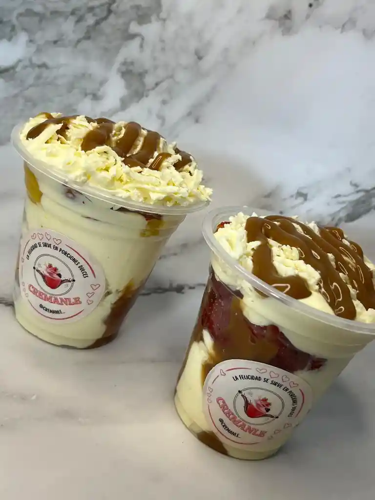 Vaso de 09 onzas con tres capas de crema artesanal, fruta fresca (puedes elegir fresa sola o combinar las frutas disponibles), un topping y salsa a elección. Tamaño perfecto para un antojito rápido y dulce.