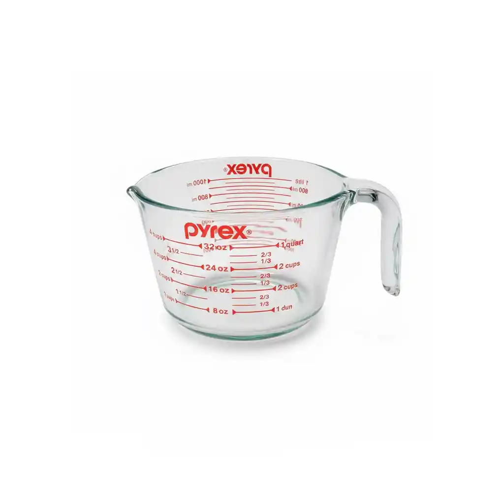 Capacidad total de 1 litro (4 tazas / 1 cuarto), ideal para medir ingredientes líquidos con total precisión en repostería y cocina. Fabricado en vidrio Pyrex de alta calidad, resistente a manchas y que no absorbe olores ni sabores de los alimentos. Graduación en rojo de fácil lectura con indicadores en tazas, onzas y mililitros para una medición exacta y rápida. Diseño ergonómico con asa robusta y pico vertedor integrado que evita derrames y facilita el vertido de líquidos. Altamente resistente a choques térmicos, permitiendo pasar del refrigerador al horno microondas sin riesgo de fracturas. Apto para uso en horno convencional precalentado, microondas, refrigerador y congelador con seguridad. Compatible con lavavajillas, lo que garantiza una limpieza profunda y sencilla sin que se borren las marcas de medición. Material no poroso y libre de BPA, cumpliendo con los más altos estándares de seguridad alimentaria para su familia. Vidrio transparente que permite visualizar claramente el contenido y el nivel de llenado desde cualquier ángulo. Estructura duradera que no se deforma ni se raya con el tiempo, manteniendo su transparencia y brillo original. Ideal para derretir mantequilla, chocolate o calentar caldos directamente en el recipiente de forma segura y práctica. Se entrega en un empaque protegido para asegurar que las piezas lleguen en perfectas condiciones hasta la puerta de tu hogar. Estos productos han sido ambientados, los accesorios adicionales no están incluidos y su color puede variar por la luz. .