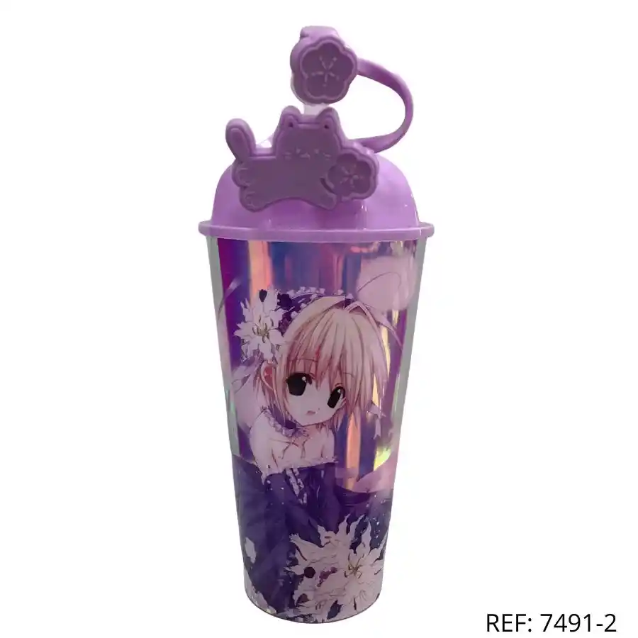 Vaso anime lila con diseño de niña y tapa decorativa, encantador y resistente.