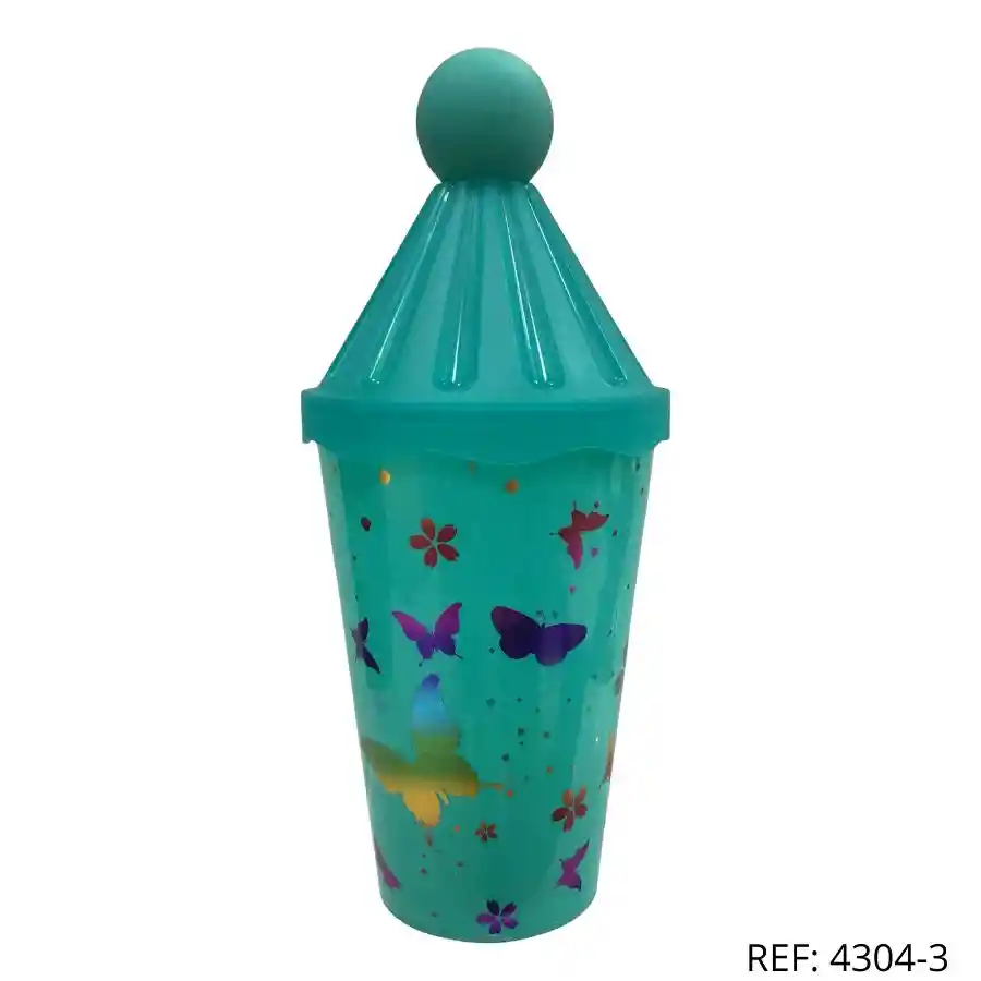 Vaso mariposas verde con tapa cónica, diseño llamativo para niños