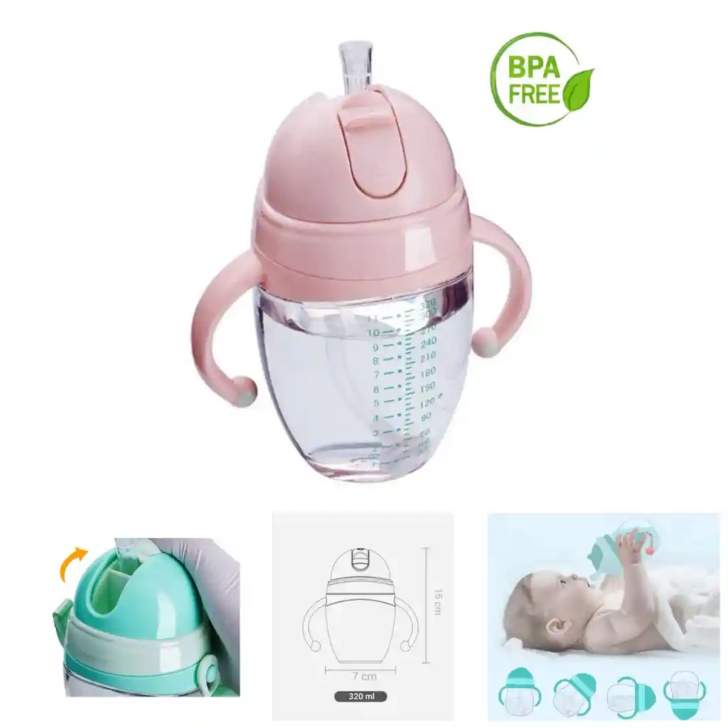 Vaso pitillo Novedoso vaso pitillo que permite succionar de él aun estando el bebé acostado. Ideal para la transición de tetero a vaso. Libre de BPA. Antiderrame Grado 5 anti-golpes