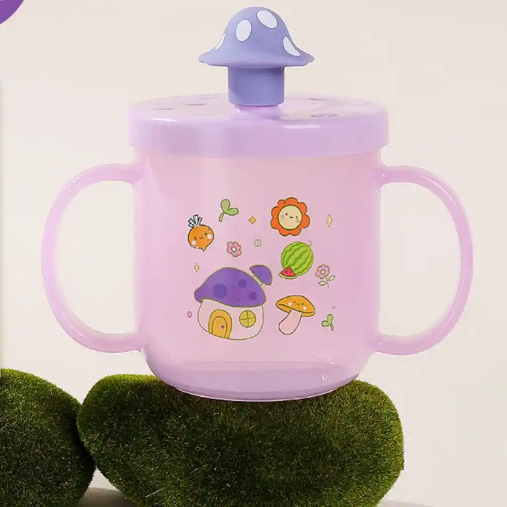 vaso entrenador o sippy cup diseñado para bebés, que cuenta con agarraderas laterales, tapa antigoteo y, en este diseño específico, un popote con una tapa decorativa en forma de hongo.
