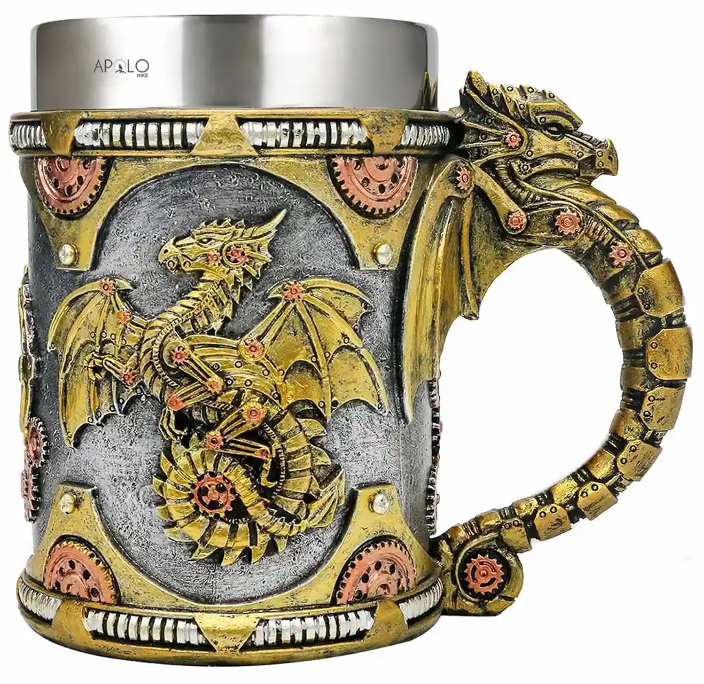 Vaso Taza Mug Dragón Dorado Steampunk Coleccionable. ¡Lleva el poder de los dragones a tu mesa con este increíble vaso estilo steampunk! Este impactante vaso combina arte y funcionalidad. Diseñado con un relieve detallado de dragón mecánico, este vaso combina el arte fantástico con un toque industrial único. Su estructura de resina tallada muestra un poderoso dragón dorado entre engranajes y texturas metálicas que lo convierten en una pieza digna de exhibición, mientras que el interior de acero inoxidable garantiza higiene, durabilidad y conservación de temperatura. Uso recomendado: bebidas, decoración temática, cosplay, fiestas medievales o steampunk. Dale un toque épico a tus momentos favoritos. ¡No es solo un vaso, es una obra de arte! Caracteristicas: - Capacidad aproximada: 400 ml - Material interior: acero inoxidable, fácil de limpiar -Exterior: resina de alta resistencia pintada a mano - Diseño ergonómico con mango de dragón articulado. - Diseño 3D con detalles mecánicos estilo steampunk - Ideal para bebidas frías o calientes El Paquete Incluye: - Vaso Taza Mug Dragón Dorado Steampunk Medieval Coleccionable.