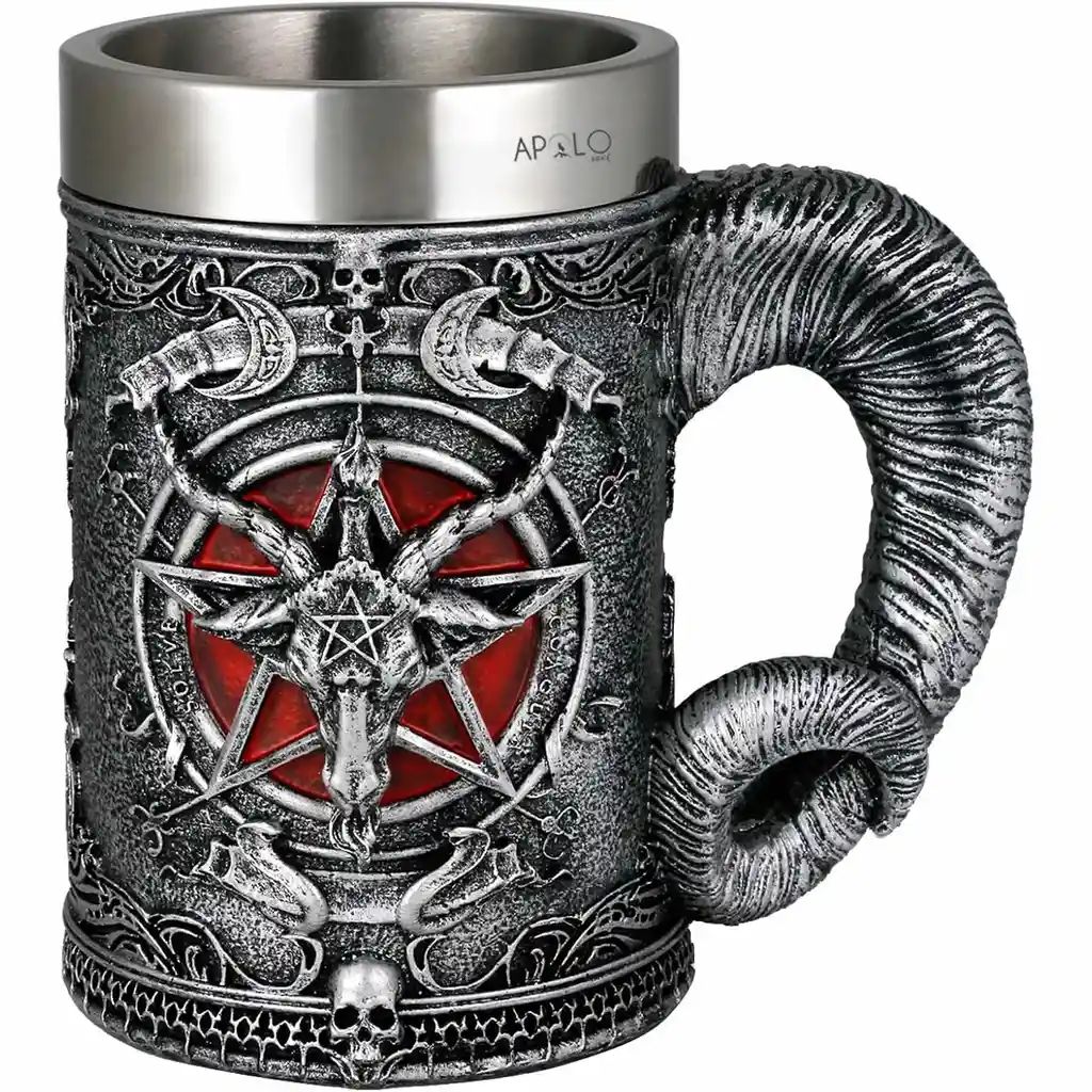 Vaso Taza Mug Gotico Baphomet con Pentagrama Coleccionable. ¡Explora el lado oscuro del arte con este impactante vaso gótico! Conecta con lo oculto y lo ancestral a través de este imponente vaso decorativo. Inspirado en el símbolo de Baphomet y el pentagrama, esta pieza representa el equilibrio entre lo material y lo espiritual. Con un diseño detallado en relieve de la cabeza de cabra Baphomet sobre un pentagrama invertido, esta pieza combina misticismo, simbolismo y carácter. Su acabado metálico envejecido y los cuernos que forman el mango lo hacen una pieza única para decoración o colección. Ideal para quienes valoran los elementos esotéricos en su vida diaria o rituales. Esta no es solo una taza... es una declaración de estilo. ¡Adquiérela y haz de tus rituales o reuniones algo inolvidable! Caracteristicas: - Capacidad aproximada: 400 ml - Material interior: acero inoxidable, fácil de limpiar -Exterior: resina de alta resistencia pintada a mano - Mango ergonómico con forma de cuerno de carnero - Ideal para bebidas frías o calientes El Paquete Incluye: - Vaso Taza Mug Gotico Baphomet con Pentagrama Coleccionable.