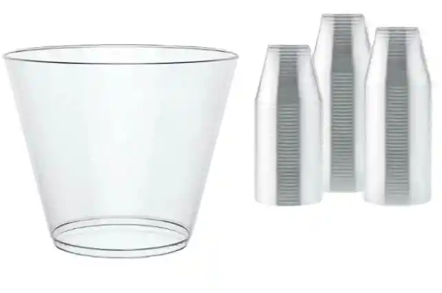 VASO 9 ONZAS EN PLÁSTICO DURO COMPLETAMENTE TRANSPARENTE PAQ X 25 UNDS BEBIDAS CALIENTES O FRIAS, MUY RESISTENTE 8.5 BOCA 7 CMS ALTURA Y BASE 5 CMS WHISKY, LICORES EN GENERAL, CÓCTELES