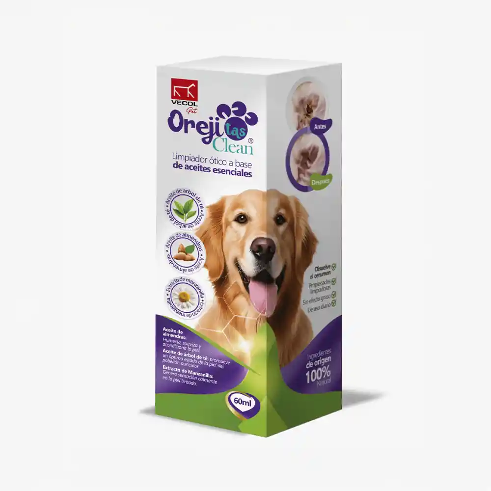Orejitas Clean® de VECOL es un limpiador ótico cosmético diseñado para perros, que utiliza aceites y extractos naturales para facilitar la remoción de suciedad del pabellón auricular y mantener la higiene Principales Beneficios: Remoción de Suciedad: Su fórmula con aceites naturales permite una limpieza profunda, eliminando la suciedad acumulada en el pabellón auricular. Hidratación y Suavidad: Con aceite de almendra, proporciona una hidratación efectiva, dejando la piel del pabellón auricular suave y nutrida. Calma y Protección: Enriquecido con aceite de manzanilla, genera una sensación calmante ideal para pieles sensibles e irritadas, protegiendo así la piel de tu mascota. Confía en Orejitas Clean ® para mantener las orejas de tu perro limpias, suaves y libres de irritaciones. ¡Haz tu pedido ahora y bríndale a tu mascota el cuidado que se merece!