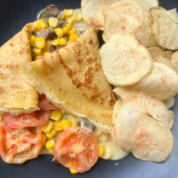 Crepe relleno de maíz dulce, queso, tomate cherry, champiñones salteados y papas margarita