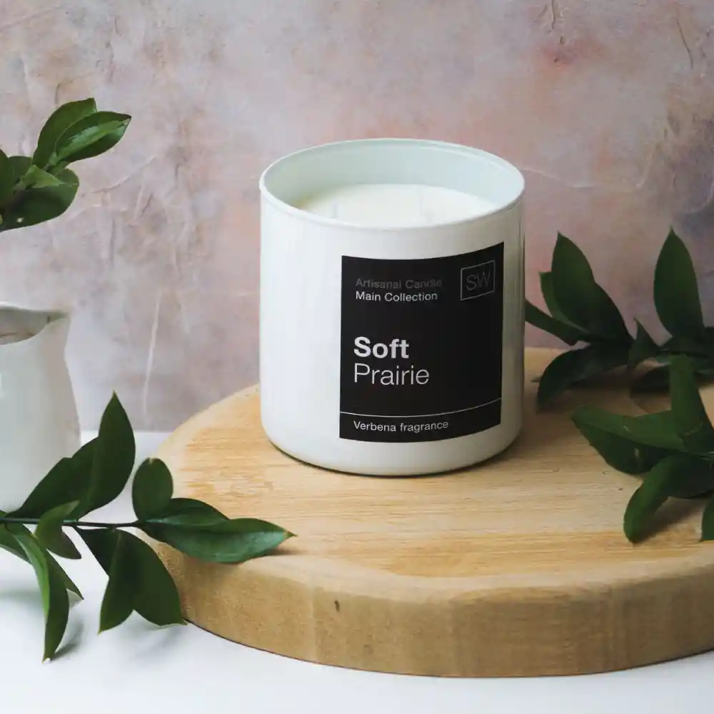 Vela 10x10 en cera vegetal en envase de vidrio transparente, fragancia verbena. Incluye empaque Luxury