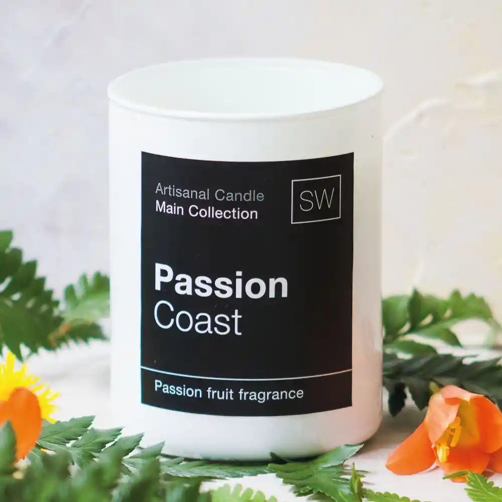 Vela 8x10 en cera vegetal en envase de vidrio transparente, fragancia maracuyá. Incluye empaque Luxury