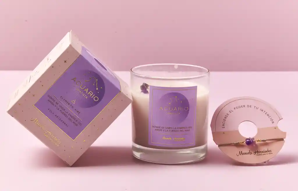 Una vela que se siente como un abrazo suave ✨ Acuario está pensada para momentos de calma, intención y conexión contigo: enciéndela, respira y deja que su luz transforme tu espacio en un refugio bonito y sereno. Viene en vaso de vidrio con un diseño precioso, incluye cuarzo cristal y una pulsera de intención, perfecta para regalar (o para darte ese detalle que te mereces).