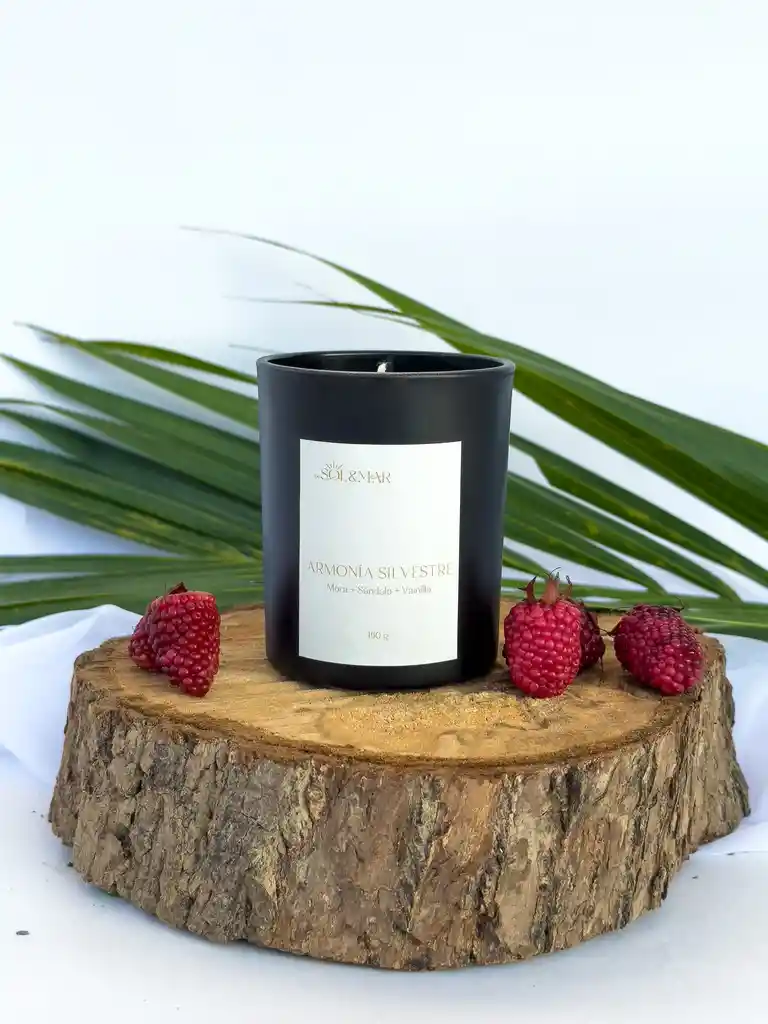 Vela aromática de armonía silvestre. Una combinación de mora, vainilla y sándalo para los amantes de los aromas frutales. Envase negro con tapa de madera.