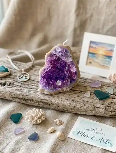 Vela aromática tipo cuarzo geoda amatista. Armoniza, energiza y aromatiza. Ideal para ambientar tu hogar, aromatizar y meditar con esta increíble pieza hecha a mano y esencias naturales.