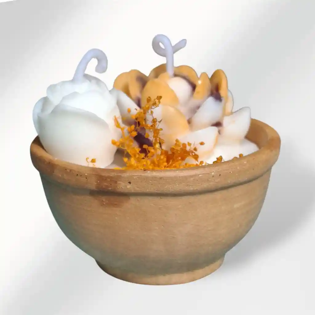 Esta delicada vela decorativa en recipiente de cerámica o terracota es una pieza artesanal llena de encanto y detalle 🕯️🌸. De color blanco cremoso, su superficie está cuidadosamente adornada con un arreglo floral en tonos amarillos, morados y blancos, que simula un pequeño jardín en flor. A un costado, destaca una pequeña rosa blanca de cera, y en la parte inferior, semillas o detalles decorativos en tonos naranja añaden textura y calidez al diseño. Perfecta para regalar o ambientar con estilo, esta vela es una fusión de aroma, arte y naturaleza en una sola pieza. 🤍💛🟣🧡