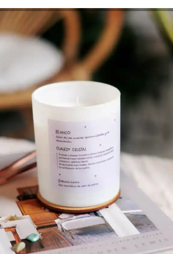Velas aromáticas de 1 mecha, hechas en cera de palma, esencias para aromaterapia variadas y pabilo 100% de algodón, vaciadas en envases de cristal blanco y cuarzo cristal en la superficie. Incluye tapa en mdf.