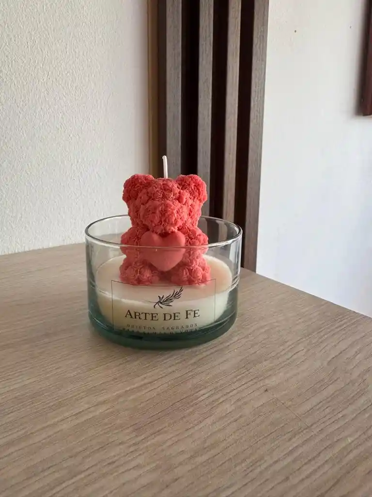 Ilumina tus espacios con ternura y espiritualidad. Nuestra vela artesanal en forma de osito rojo con corazón está elaborada con cera natural y fragancia suave que inspira calma, amor y gratitud. Presentada en un elegante vaso de vidrio con el sello de Arte de Fe – Objetos sagrados para almas devotas, es perfecta para regalar, decorar o acompañar momentos de oración y conexión interior. Cada pieza es única, hecha a mano con intención y amor. Aroma: Dulce frutal Presentación: Vaso de vidrio reutilizable Origen: Hecho en Colombia 🇨🇴