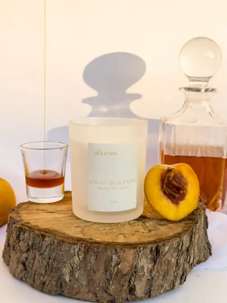 Vela aromática de cóctel de durazno. Una combinación de miel, durazno y cognac. Tiene un aroma para los que disfrutan de aromas un poco neutros. Es un poco dulce.