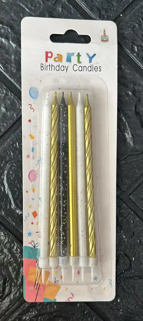 VELA CUMPLEAÑOS LARGA X6 ESCARCHADA DORADA / BLANCA / NEGRA COD.1802