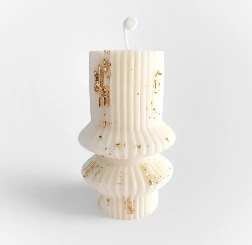 Vela blanca golden artesanal perfumada. Velas elaboradas con cera 100% natural de soya, hechas con mucho amor y dedicación. Medidas: 11cm alto x 7cm ancho x 5cm diámetro