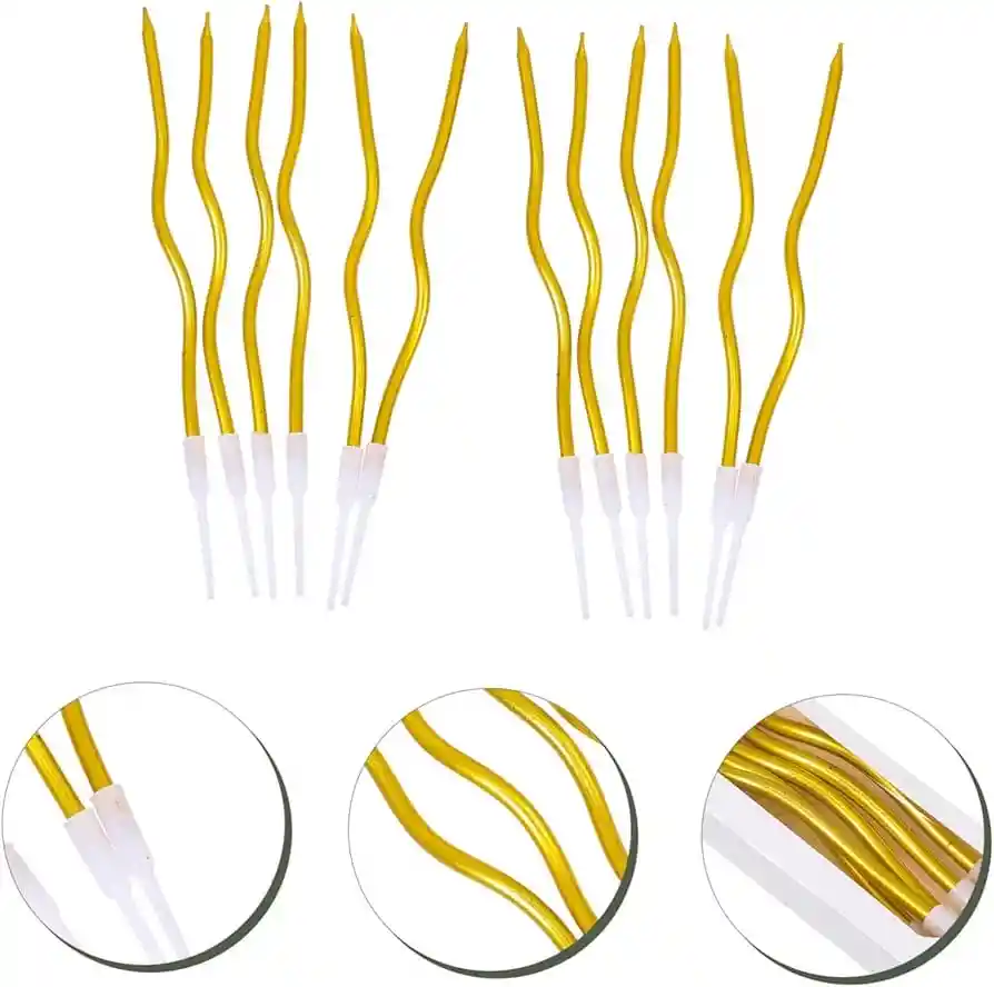 Vela Espiral dorada Lisa X12 unidades Pide el mejor deseo en tu cumpleaños. •Tamaño: 16cm Alto •Material: Parafina •Paquete: 12 unidades