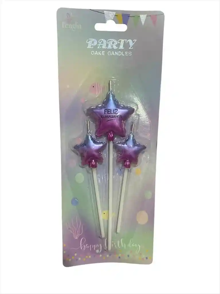 Vela Figura estrellas con Frase Feliz Cumpleaños. Incluye una vela con frase de feliz cumpleaños de 16cm alto y dos velas de 11cm alto