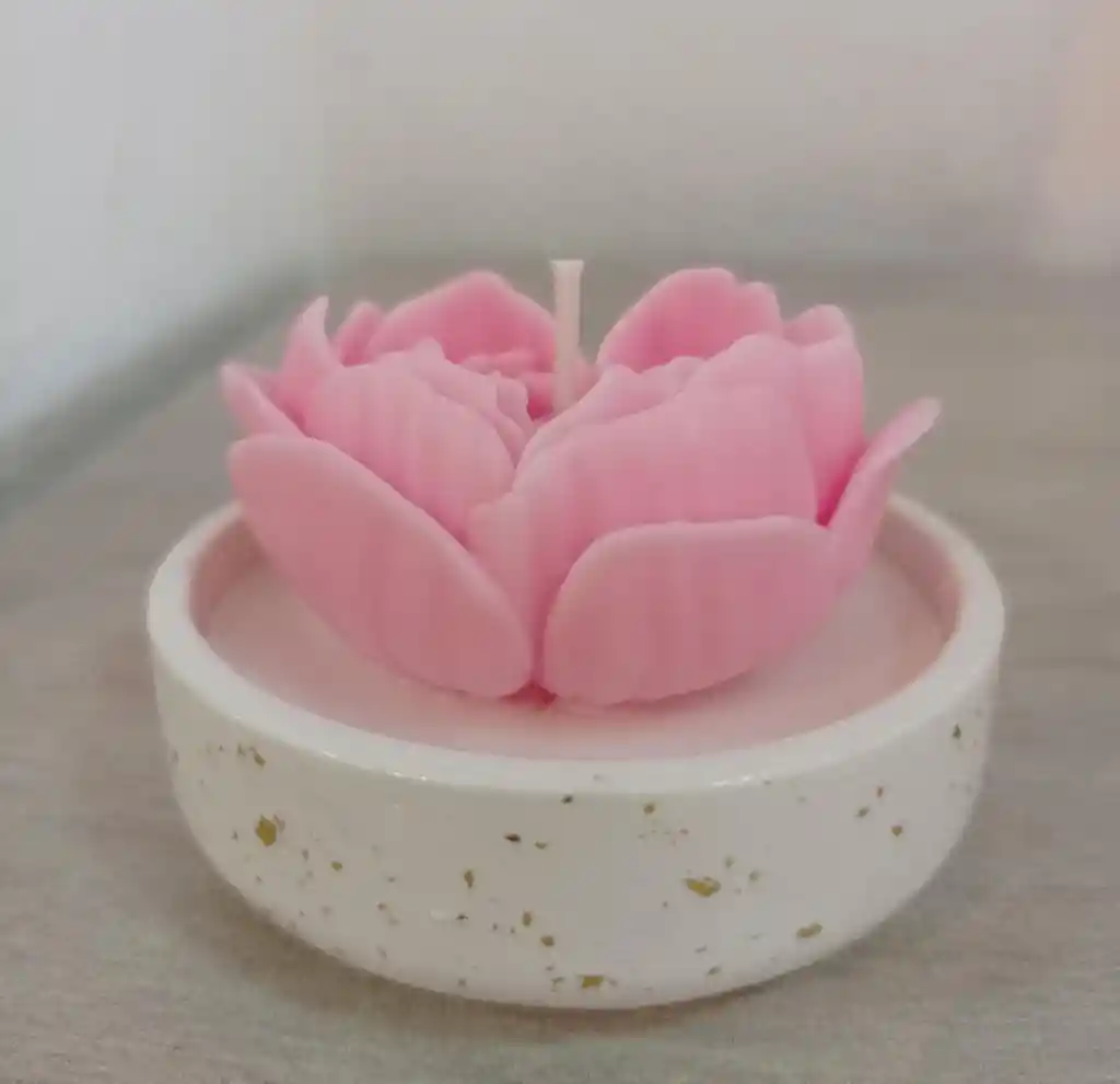 Vela elaborada en Cera Vegetal. Agradable aroma. Diseño de Rosa. Base elaborada en Yeso.