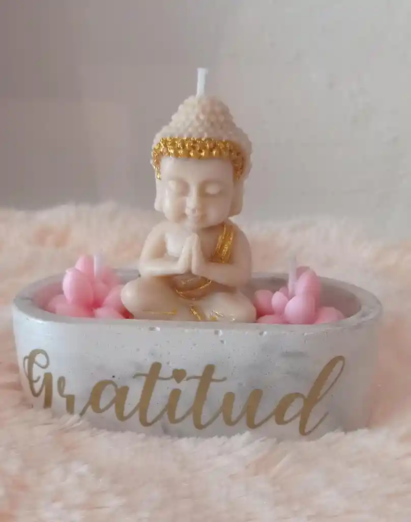 Vela elaborada en cera vegetal con agradable aroma. Diseño Buda. Base en concreto.