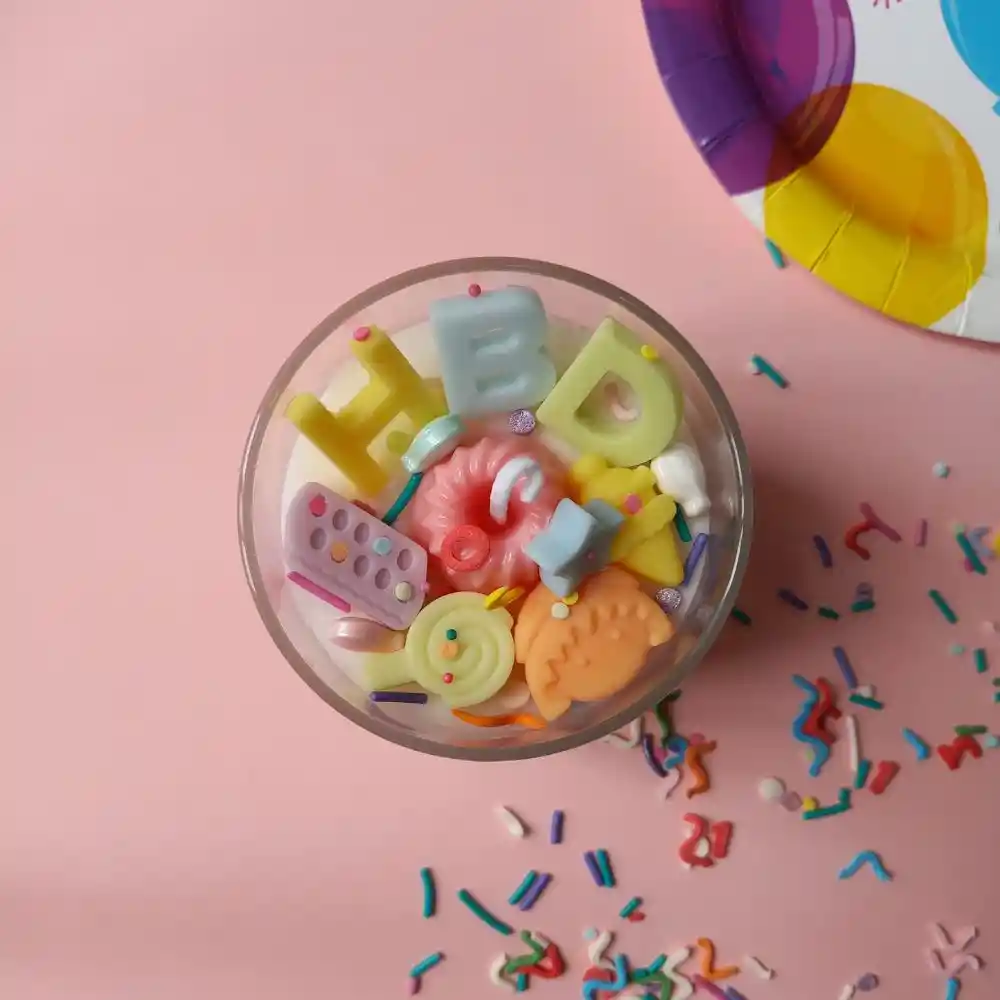 Vela decorada con moldes de cumpleaños. Aroma: Galletas y crema. Incluye caja de cartón como empaque y tarjeta De: Para: Dimensiones: 7.5cm de alto x 7.5cm