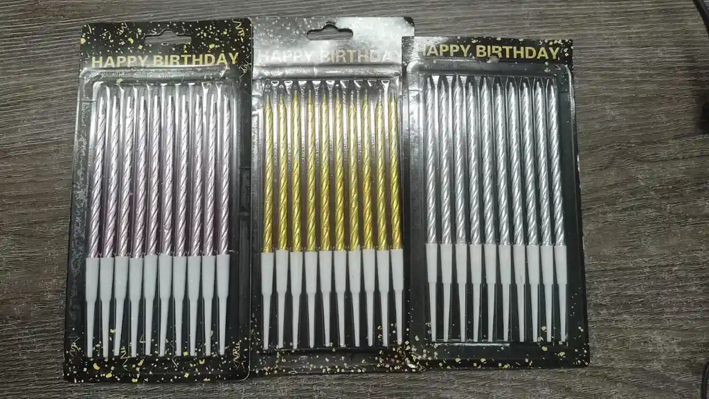 vela larga, de 10 unidades por paquetes, disponible en dorado plateado, y rosa.