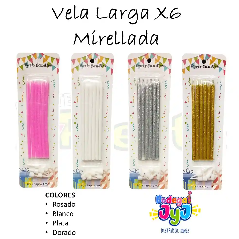 la vela es delgada y larga, trae la base para cada una y viene en colores escarchados. COLORES Rosado - Blanco. POR FAVOR DEJAR EN LOS COMENTARIOS EL COLOR QUE NECESITES