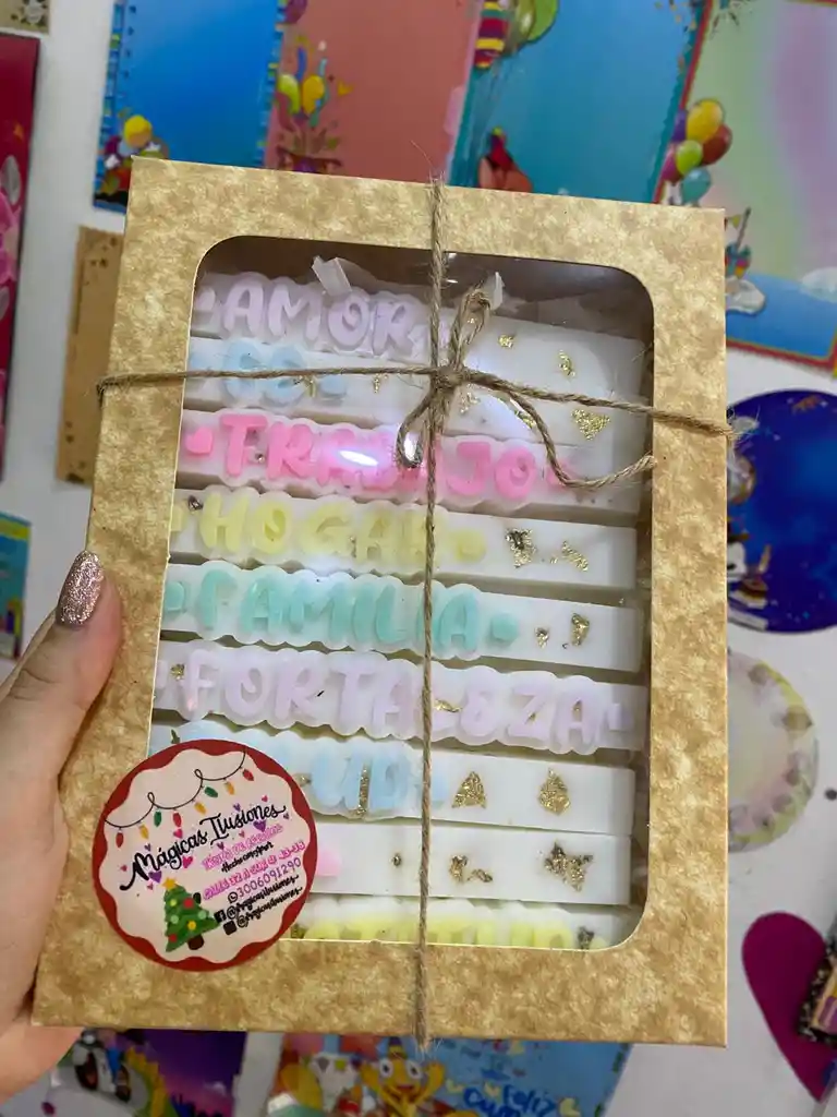 Caja x9 velas navideñas, letra timoteo en alto relieve