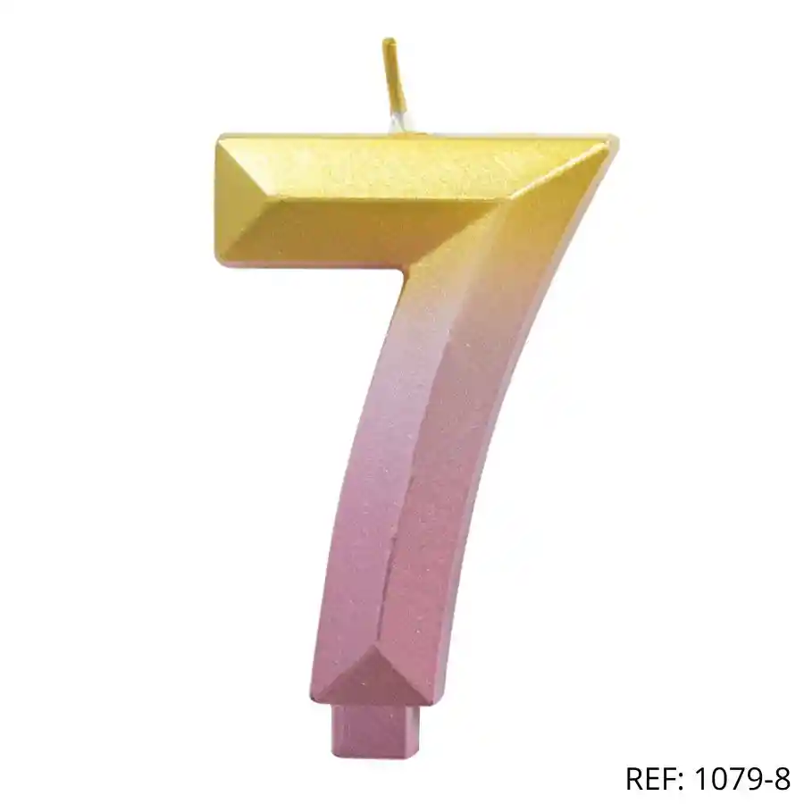Vela número 7 con diseño geométrico en tonos dorado y rosa. Perfecta para decorar cumpleaños con estilo moderno.