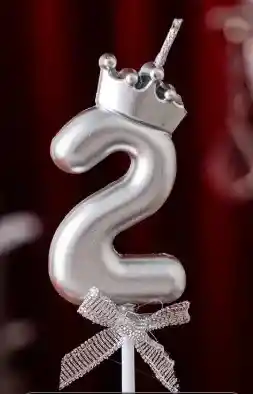 VELA PREMIUM METALIZADA CUMPLEAÑOS NUMERO 2 CON CORONA COLOR PLATEADO