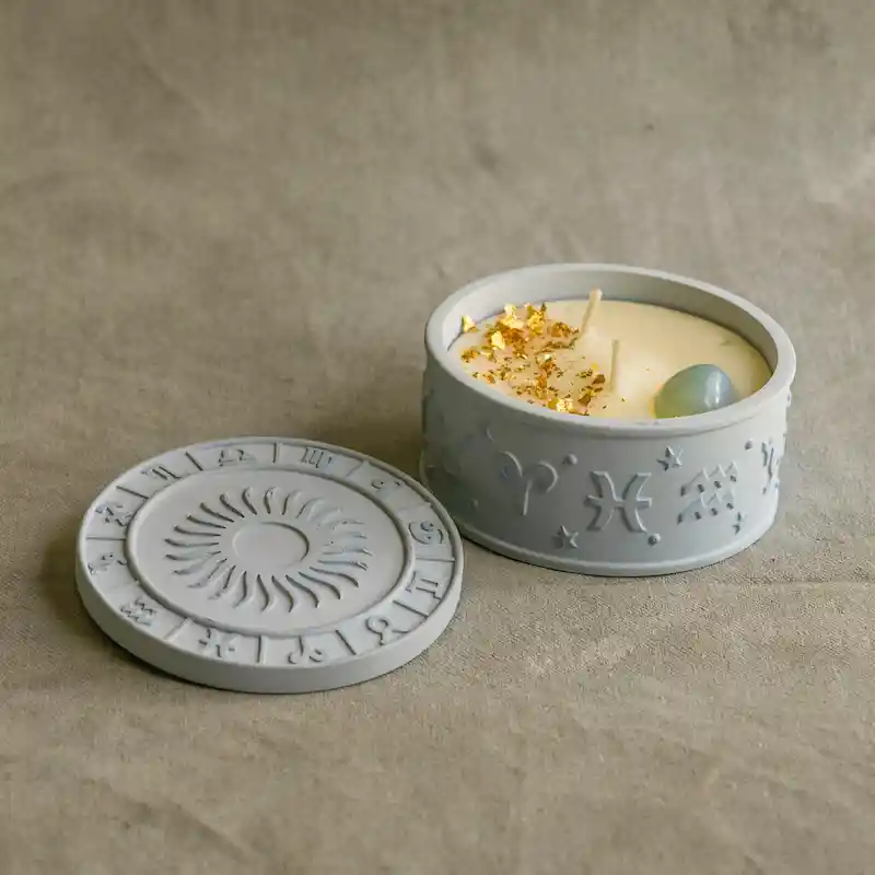 Conecta con su poder de la Aguamarina que te brinda tranquilidad y armonía.Ayuda a mantener la calma y la concentración. Recipiente: Concreto, Al ser un recipiente hecho a mano el color puede tener un pequeña variación con referencia a la imagen. Piedra: Aguamarina Cera vegetal Medidas: 8,8cm x 4,5cm Aroma: surtidos (entre cuales)
