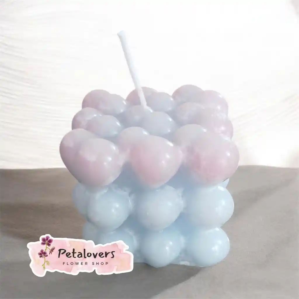 Moderna y sofisticada, esta vela en forma de cubo con diseño de bolitas en cera azul aporta un toque de calma y estilo a cualquier ambiente