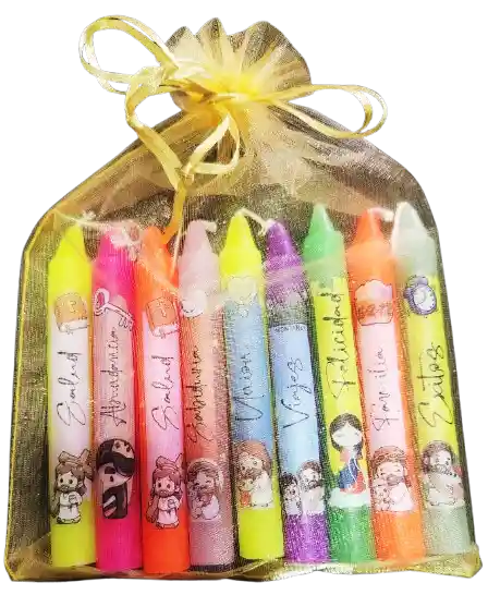velas de colores, decoradas con peticiones de fe, X 10 und.11.5 lar X 1.5 an.