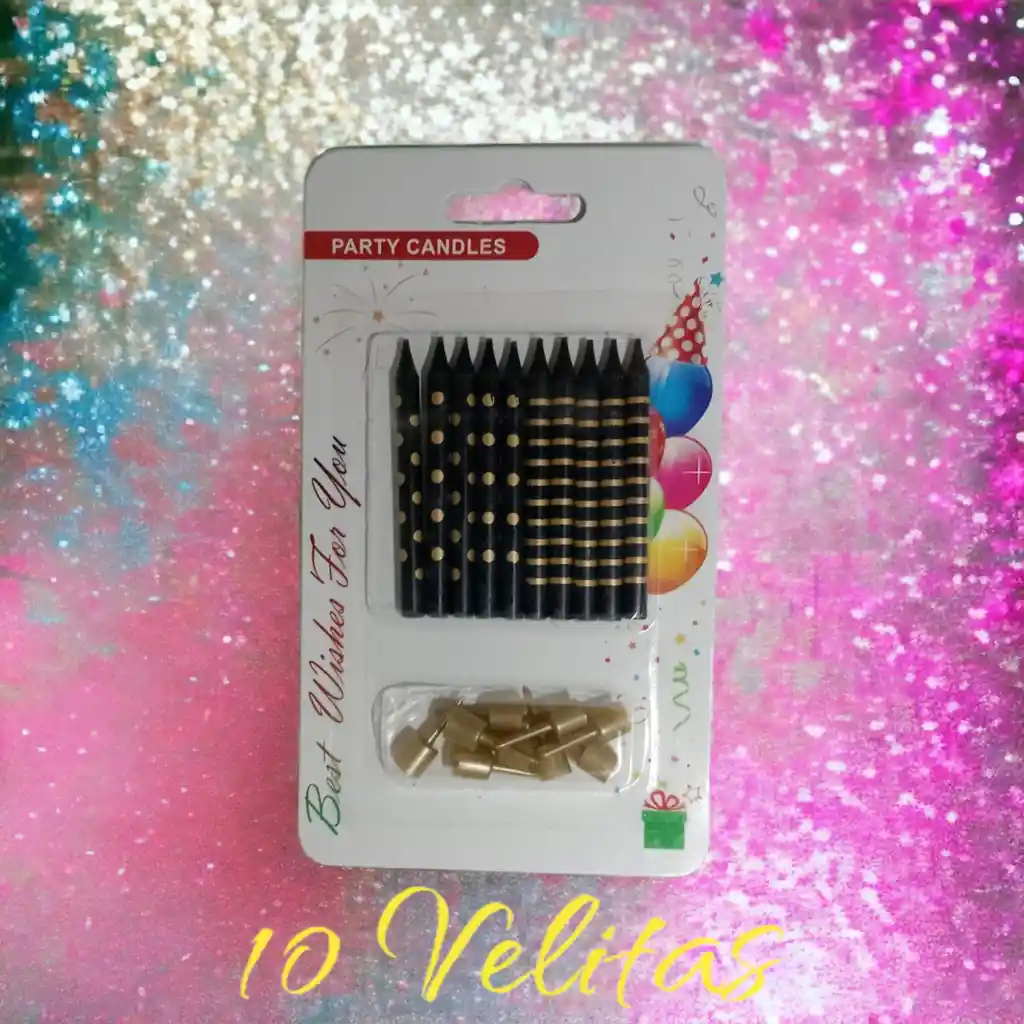 VELAS DE CUMPLEAÑOS 10 pcs MEDIDAS DE CADA VELA: 6CM CANTIDAD: EMPAQUE POR 10 UNIDADES COLOR: NEGRO / DORADO