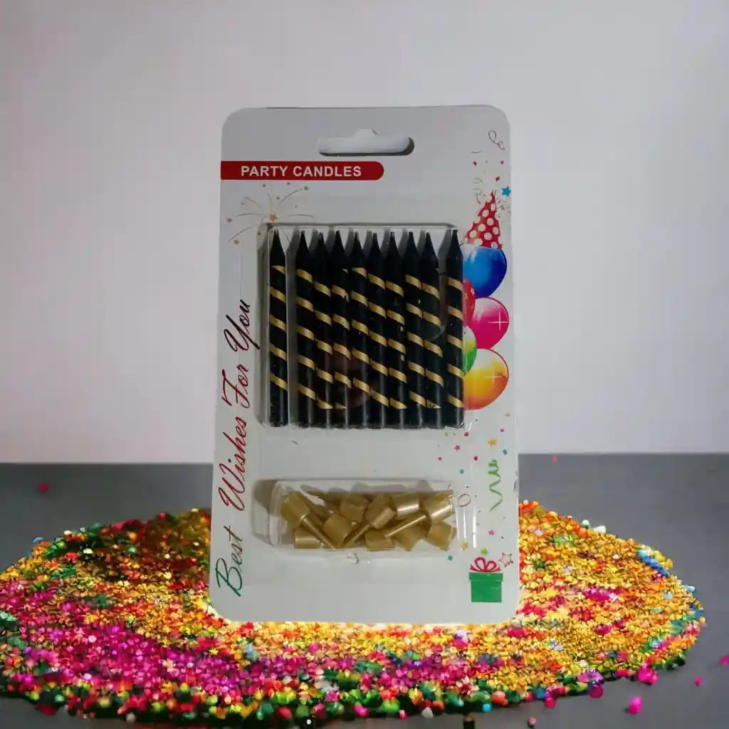 VELAS DE CUMPLEAÑOS 10 pcs MEDIDAS DE CADA VELA: 6CM CANTIDAD: EMPAQUE POR 10 UNIDADES COLOR: NEGRO / DORADO