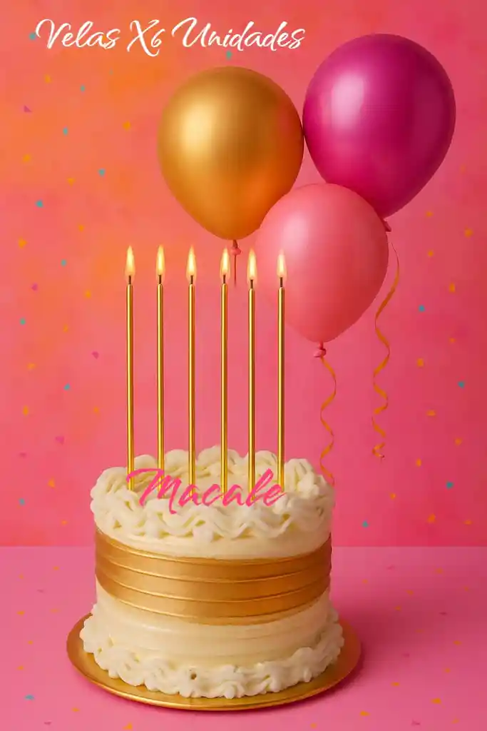 Set de 6 velas largas Doradas – 25 cm Elegantes y sofisticadas, estas 6 velas largas de color dorado (25 cm cada una) son perfectas para dar un toque de glamour a tus pasteles. Su diseño fino y brillante las hace ideales para celebraciones especiales como cumpleaños, aniversarios o bodas. Fáciles de encender y con una combustión uniforme, decoran sin opacar el protagonismo del pastel.