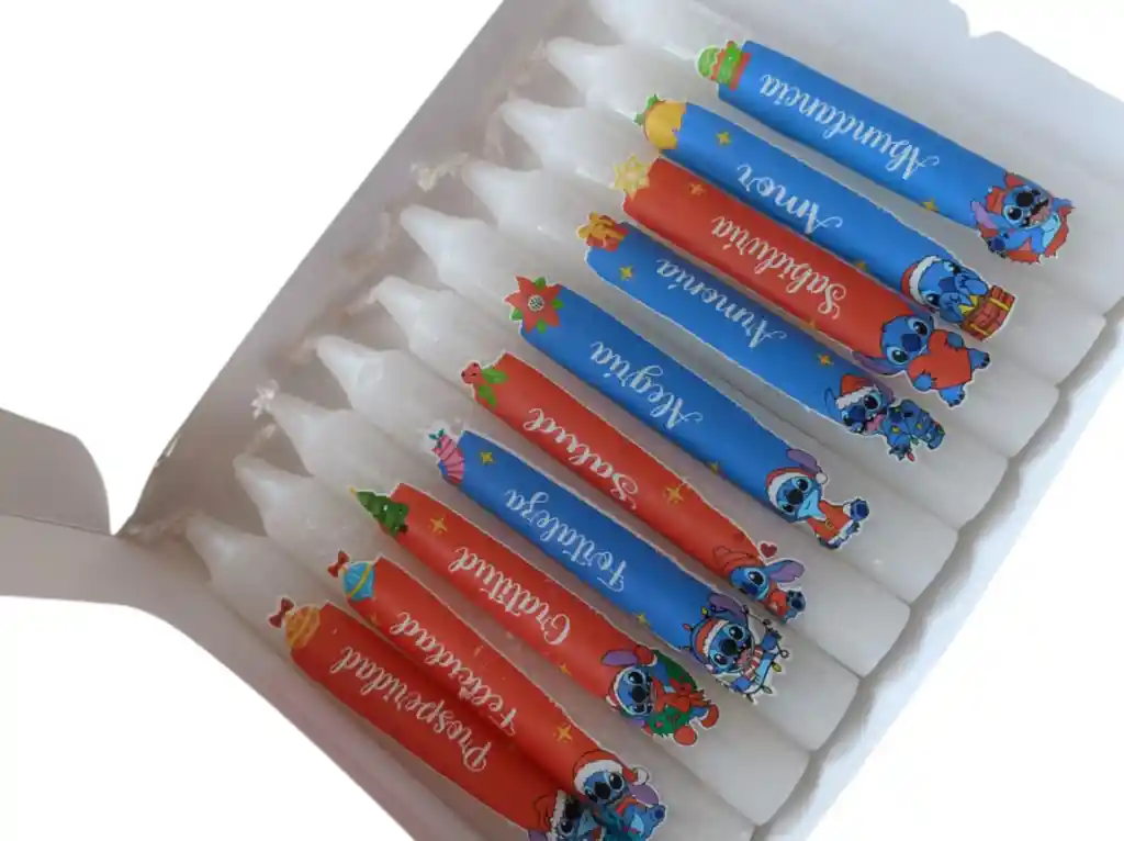 Paquete de velas X10 con Deseos para alumbrar tu noche de Velitas este 7 de Diciembre. Referencia: Vela blanca con mensajes de stitch Empaque: Caja Medidas: 12 CM de alto - x1.5 diámetro.