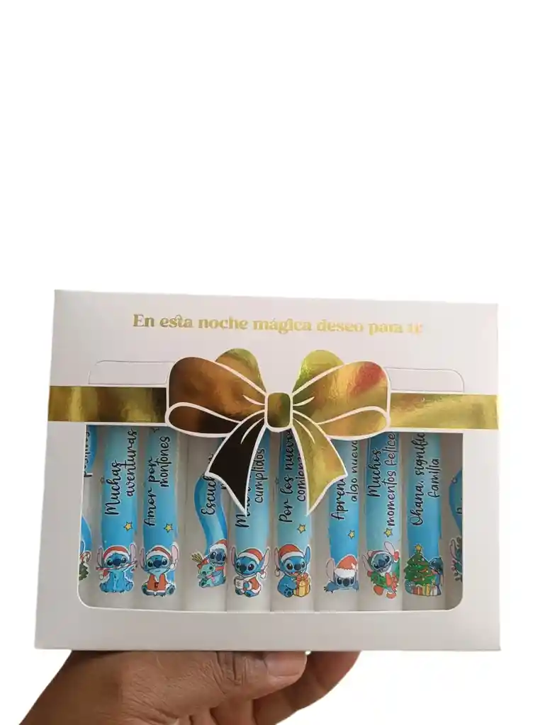 Paquete de velas X10 con Deseos para alumbrar tu noche de Velitas este 7 de Diciembre. Referencia: Vela blanca con mensajes de stitch Empaque: Caja Medidas: 12 CM de alto - x1.5 diámetro.