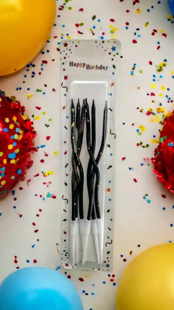 Descripción Velas en Espiral para Cumpleaños Happy Birthday •6 velas Espiral color Negro/Dorado •15cm de altura •incluye base plastica