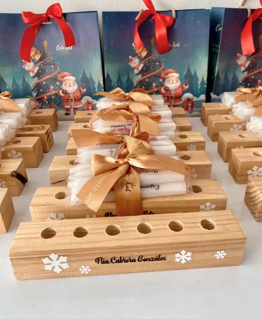 6 velas blancas aromatizadas con el caracteristico olor a la navidad; Cada velita con frases intencionales; Base en madera de pino decorada con copos de nieve, para poner las velitas ; Se etregan las velas atadas a la base; Moño en cinta de seda
