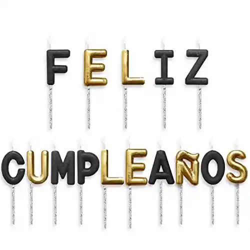 Velas para cumpleaños , las velas forman la palabra FELIZ CUMPLEAÑOS en dorado y negro