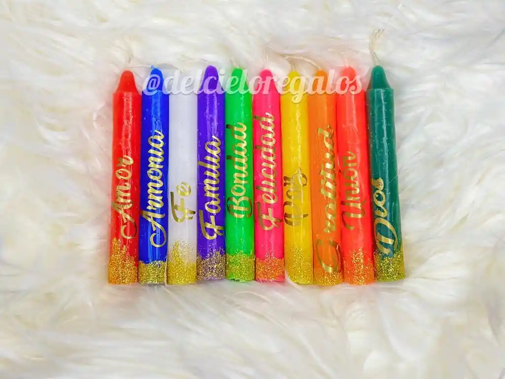 Velas personalizadas con diferentes palabras par atraer los mejores deseos, este 7 de diciembre Se entrega empacada y marcada, cada vela tiene un alto de 12cm aproximadamente