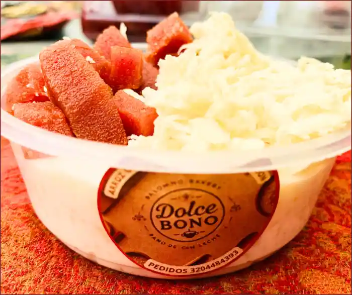 Exquisito y cremoso arroz de leche de la abuela acompañado con trozos de bocadillo y queso fresco