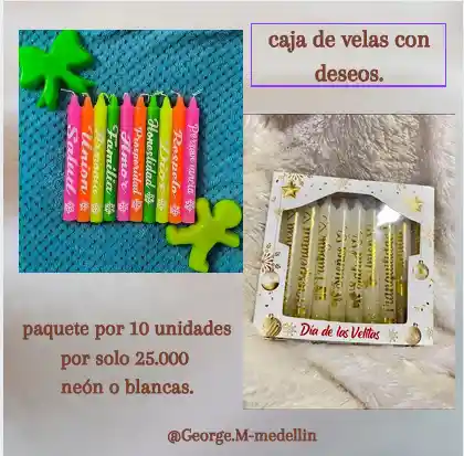 Velitas con deseos: ilumina tus momentos especiales" ✨ Agrega un toque mágico a tus celebraciones con estas velas únicas. 🎁 Paquete de 10 unidades por solo $25,000: Diseño disponible en colores neón vibrantes o blanco clásico. Cada vela tiene un deseo especial grabado, ideal para regalar o para llenar de significado tu espacio. 🌟 Perfectas para el Día de las Velitas, cumpleaños, aniversarios o cualquier ocasión especial. 📍 Haz que cada deseo cobre vida.