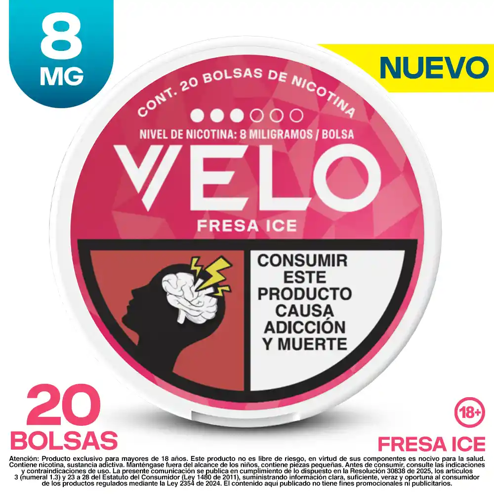 Pouche de Nicotina marca Velo sabor a Fresa. Fuerza de nicotina: 8 mg. Bolsa de nicotina de administración oral equivalente a aproximadamente 1 paquete de cigarrillos. Prohibida la venta a menores de edad. Producto nocivo para la salud que contiene nicotina, sustancia altamente adictiva. Antes de consumir consulte las indicaciones y contraindicaciones de uso.