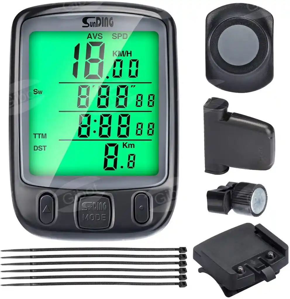 VELOCÍMETRO ALAMBRICO CON LUZ DE FONDO VERDE - 26 funciones principales. - Pantalla LCD. - Resistente a la lluvia. - Fácil instalación, buena durabilidad. - Alimentado por batería CR2032. - Fácil de leer pantalla LCD, compañero ideal para su bicicleta. ESPECIFICACIONES TÉCNICAS: 1. SPD : velocidad actual 2. ODO : odómetro 3. DST : distancia de viaje 4. MXS : velocidad máxima 5. AVS : velocidad promedio 6. TTM : tiempo total de viaje 7. TM : tiempo de viaje 8. RAT : tiempo total de conducción 9. CLK : reloj ( 12 H - 24 H ) 10. SW : cronómetro 11. Temperatura 12. TM UP : tiempo de viaje hasta 13. TM DN : tiempo de viaje conteo regresivo 14 TRIP UP : distancia de viaje hasta 15. TIRP DN : distancia de viaje conteo regresivo 16. Comparador + / - 17. Alerta de mantenimiento 18. Recordatorio de cuidado 19. Recordatorio de exceso de velocidad 20. Indicador de batería baja 21. Configuración de la circunferencia de los neumáticos ( 0mm - 9999 mm ) 22. Ajuste del último valor del cuentómetro - odo 23. Configuración del último valor del tiempo total 24. Memoria de marco congelado 25. Con luz de fondo 26. Auto ON - OFF