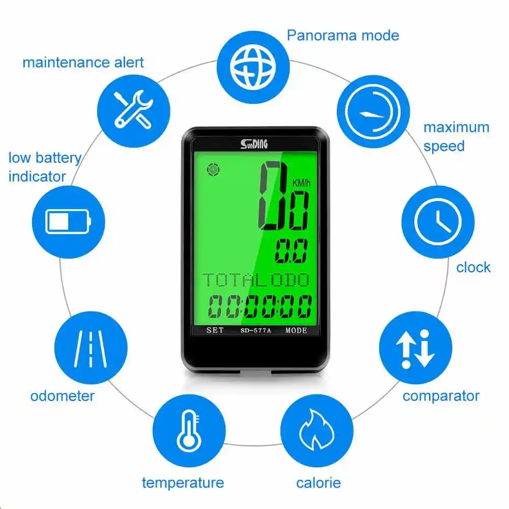 VELOCIMETRO SUNDING 577A DE CABLE, MULTILENGUAJE, CALORIAS, FECHA Y HORA 2,8 PULGADAS Cuenta con una pantalla con buena resolución y retroiluminada automáticamente con la oscuridad, Son 8 idiomas (Alemán, Frances, Países Bajos, Suiza, Español, Italiano, inglés, Chino). Puede escoger cuales valores medidos se van a visualizar y ocultar, adicional tiene modo panorámico que puede escoger 3 funciones que se muestre siempre en la lineal que indica la función actualmente mostrada, para poder 4 mediciones o la hora al mismo tiempo. También cuenta la opción de Scan que va cambiando entre las funciones automáticamente sin estar presionando los botones. Posee un control remoto para ser ubicado al alcance del pulgar y cambiar las funciones o activar la luz, se recomienda se utilizado por seguridad para evitar distracciones y en especial en momentos de lluvia que baja la visibilidad. Configura el peso del usuario para tener una medida aproximada de las calorías y grasa quemada, también registra los km realizados en el día, poder llevar un control para un entrenamiento de perdida de peso. FUNCIONES - Velocidad (0 A 99,9 KM/H o M/H) -ODO Kilometraje Total, odómetro Total (0 A 9999 KM/H) -DST Kilometraje Dia, distancia única -MAX Velocidad máxima -AVS Velocidad media/velocidad -RIDETIME Tiempo de un recorrido (0:00:00 A 99:59:59 Hrs) -TOT TIME Tiempo Total (0 ~ 9999Hrs) sostiene el botón SET 3seg para ajustar la configuración inicial. -TEMP Temperatura (-20 °C ~ 70 °C) -TEMP MAX Temperatura máxima -TEMP MIN Temperatura mínima -TRIP DNN Cuenta atrás de kilometraje -TRIP TDN Cuenta atrás -STPWATCH Cronómetro -GEAR RATIO relación de engranajes -CAL Calorías calorías -FAT BURN Quema grasa -Modo de visualización panorámica -SCAN Menú de bucle -Reloj (12/24H) -Fecha (AÑO/MES/DIA/SEMANA) -Alerta de mantenimiento -Batería Baja ESPECIFICACIONES TÉCNICAS: - TAMAÑO PRODUCTO: 5,3 x 4,2 x 1,3 cm - TAMAÑO PANTALLA: 2,8 Pulgadas - MODELO: Cable - RESISTENTE AL AGUA: Si IPX6 - COLOR: Negro - BATERIA: Pila 2030 - COLOR DE RETOILUMINACIÓN: Verde - MONTAJE: MANILLAR EL EMPAQUE INCLUYE LOS SIGUIENTES ARTÍCULOS: - Computadora para bicicleta - Soporte para Computadora Cable del sensor y control Remoto - Imán - 1 baterías - Amarres - Manual en Ingles