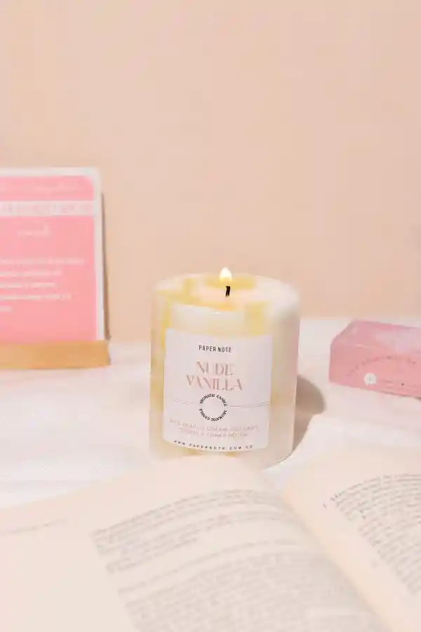 Vela aromática ideal para ambientar y decorar tus espacios favoritos. Nuestra vela Nude vanilla está compuesta con crema de vainilla, coco y notas de galleta con haba tonka.